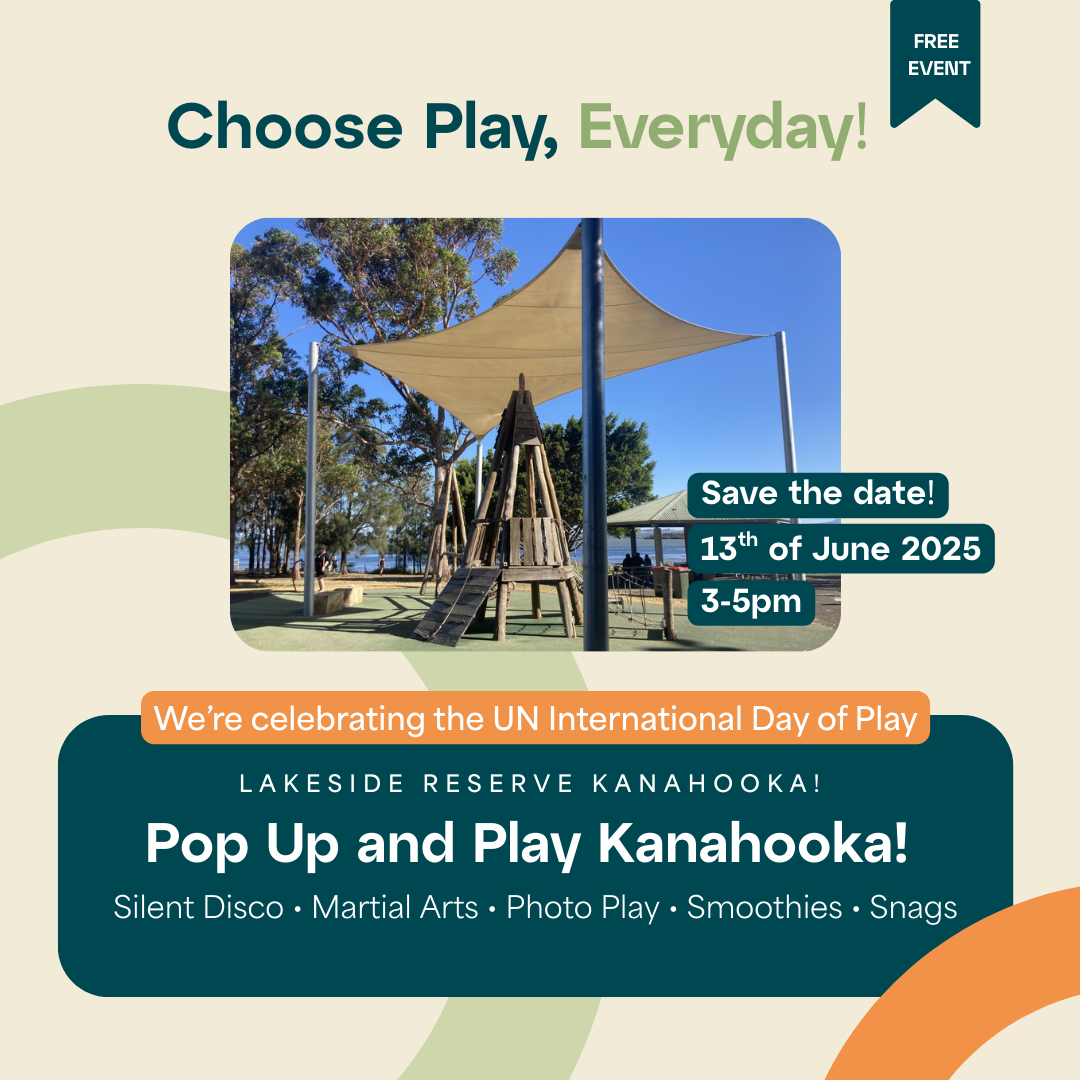 Friday, 13th June Choose Play, Everyday! Need an easy afternoon plan the kids will actually love? We’re throwing a free community event to celebrate the UN International Day of Play, and it’s packed with fun! 🕺 Silent disco 🥋 Martial arts sessions 📸 Photo play corner 🍓 Smoothies + snags 🧸 Pop Up & Play for the little ones Friday 13 June | 3–5pm | Kanahooka It’s all about choosing play, every day, and yes, parents, you can join in too 😉 Come hang out, meet other families, and let the kids burn off some energy. Free, fun, and no booking needed! #healthycitiesaustralia Map Friday, 13th June, 3 pm-5pm Lakeside Reserve Kanahooka! $FREE Get tickets Share this event