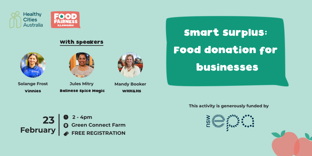 Monday, 23rd February Smart Surplus: Food Donation for Businesses Do you work at, own or manage a food business in the Illawarra? Join us at this free practical forum for local hospitality, food retail and food production businesses looking to reduce food waste, save on disposal costs, and donate surplus food safely and legally. Hear from local food relief organisations and hospitality operators already integrating food donation into their business, and get hands-on guidance from the new Hospitality Food Donations Guidelines, including NSW legislation updates so that you’re clear on your rights when it comes to donating food. The afternoon includes guest speakers Mandy Booker, CEO of Wollongong Homeless Hub & Housing Services, Solange Frost, Regional Director of Operations at Vinnies, and Jules Mitry, Owner of Balinese Spice Magic. We’ll also serve up some afternoon tea, and you can take a stroll around the beautiful urban farm. You’ll come away from this afternoon with the tools, confidence, and pathway to turn your surplus into community impact. Map Monday, 23rd February, 2 pm-4 pm Green Connect Farm $FREE Get tickets Share this event